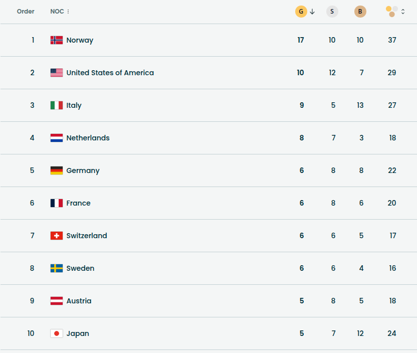 La Norvège 🇳🇴 remporte son 17è titre bat le record de titres olympiques remportés par un pays dans une même édition des JO (17). Record qu'ils détenaient déjà depuis Pékin 2022. Il ne sont plus qu'à 2 médailles aussi de leur record de médailles. Les Pays-Bas 🇳🇱 remontent à la 4è place grâce à 2 nouveaux titres. 28 NOCs (Pays) différents ont remporté au moins une médaille. Top 10 :